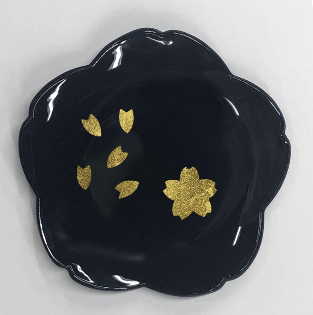 銘々皿やお弁当箱、ストラップなど土台となるモノと、型抜きシールを選んで、どう貼るかデザインを考えます。豊富な種類の中からお好きなものをお選びいただけます。かといって、欲張っていっぱい貼ると後で金箔を貼る時に難しくなるので、1〜3枚程度がおすすめです。