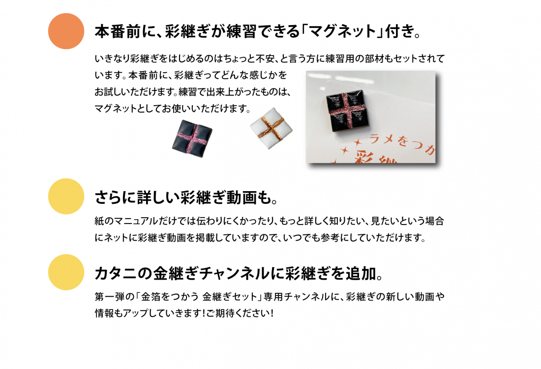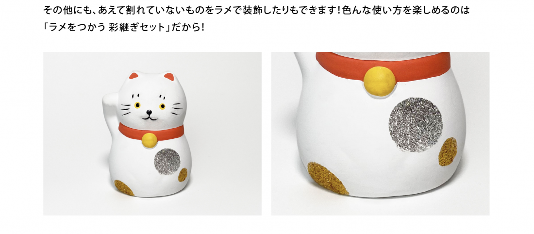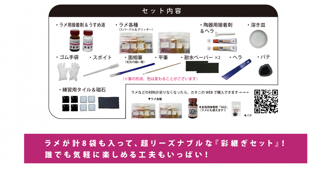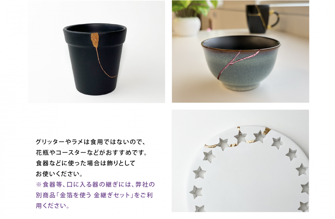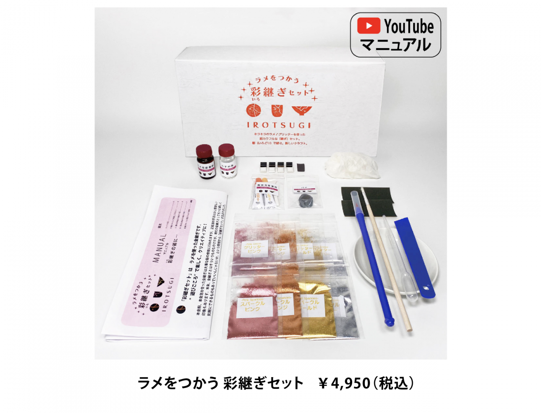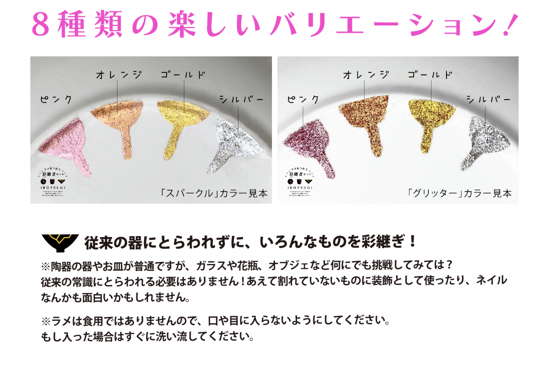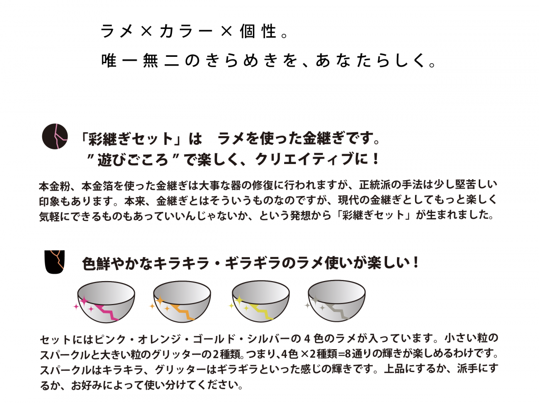 キラキラのラメ/グリッターを使った超カラフルな「継ぎ」セット。彩(いろどり)で継ぐ新しいクラフト。