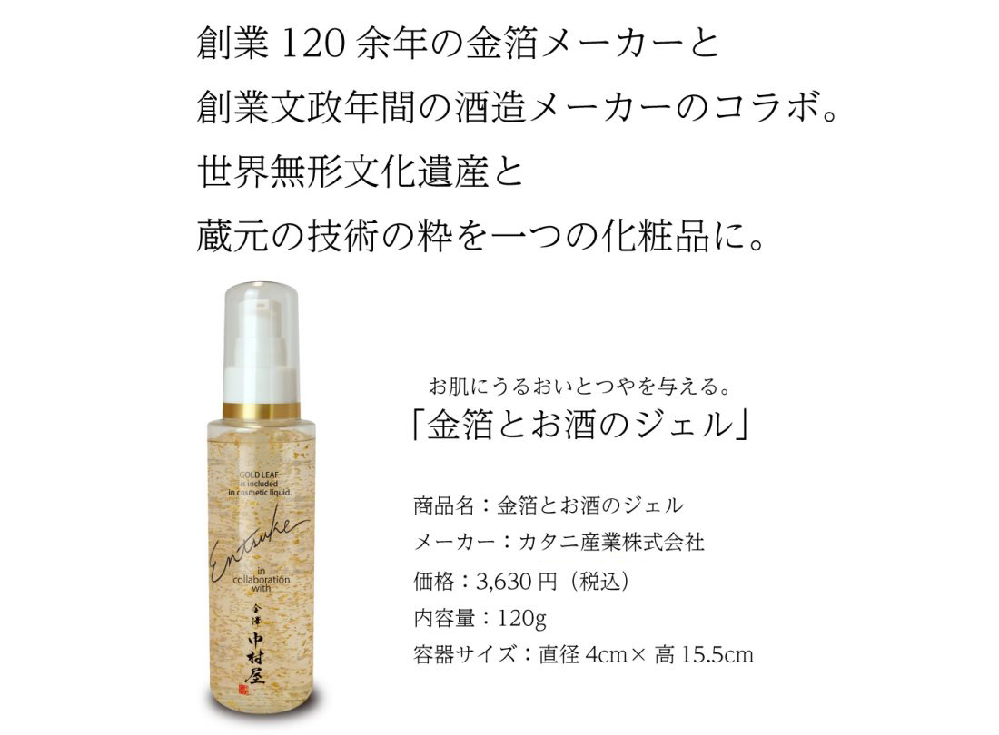 貴重な金、酒エキスの他にも、お肌に良いとされる成分を複数配合。ヒアルロン酸より保湿力があるとされる自然由来の「水溶性プロテオグリカン」や各種セラミドを配合し、お肌にうるおいとつやを与える理想の化粧品を目指しました。