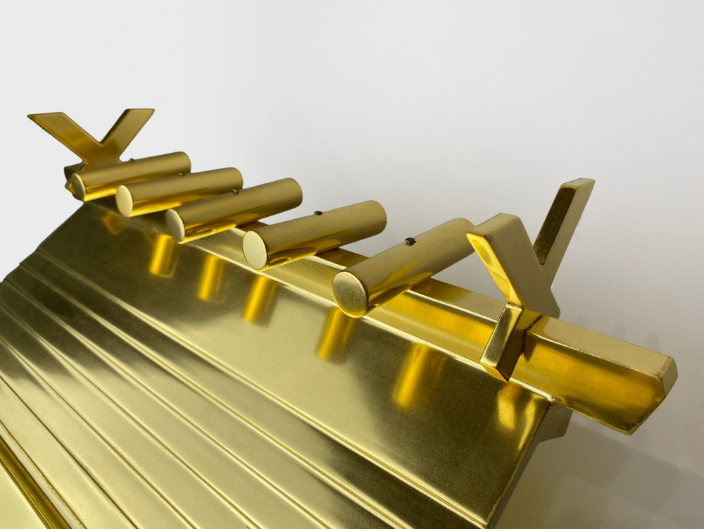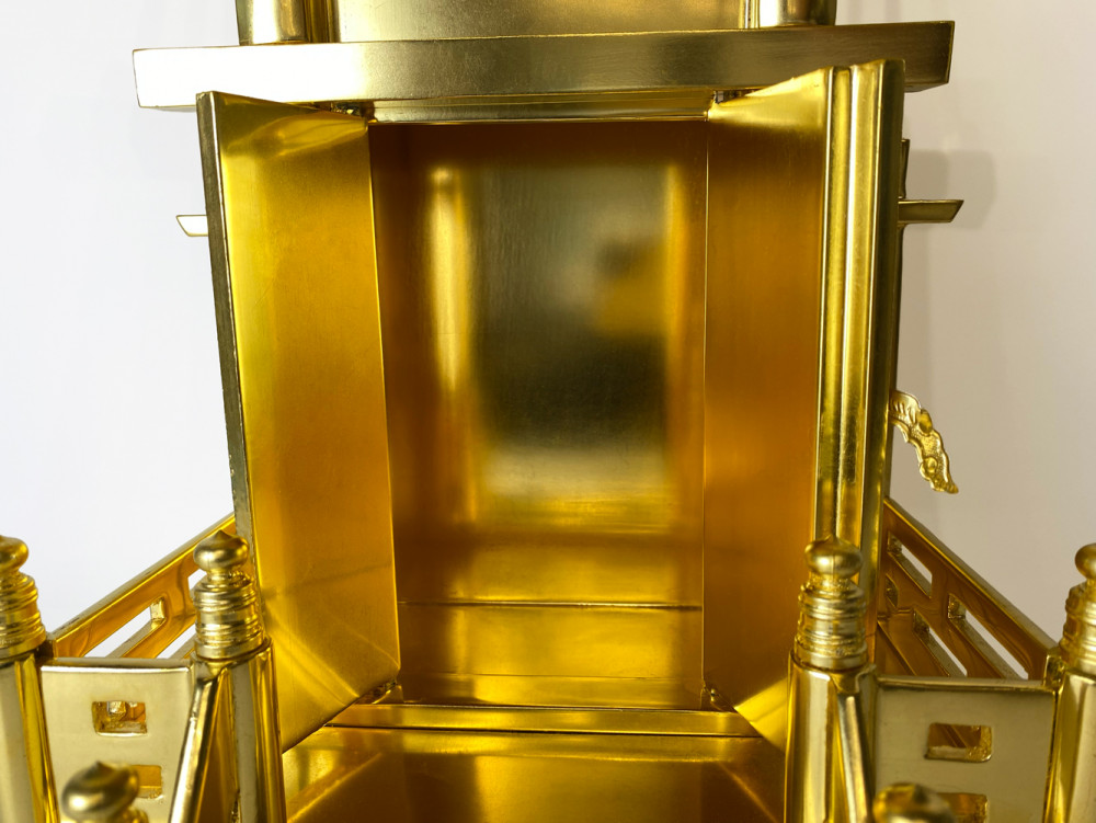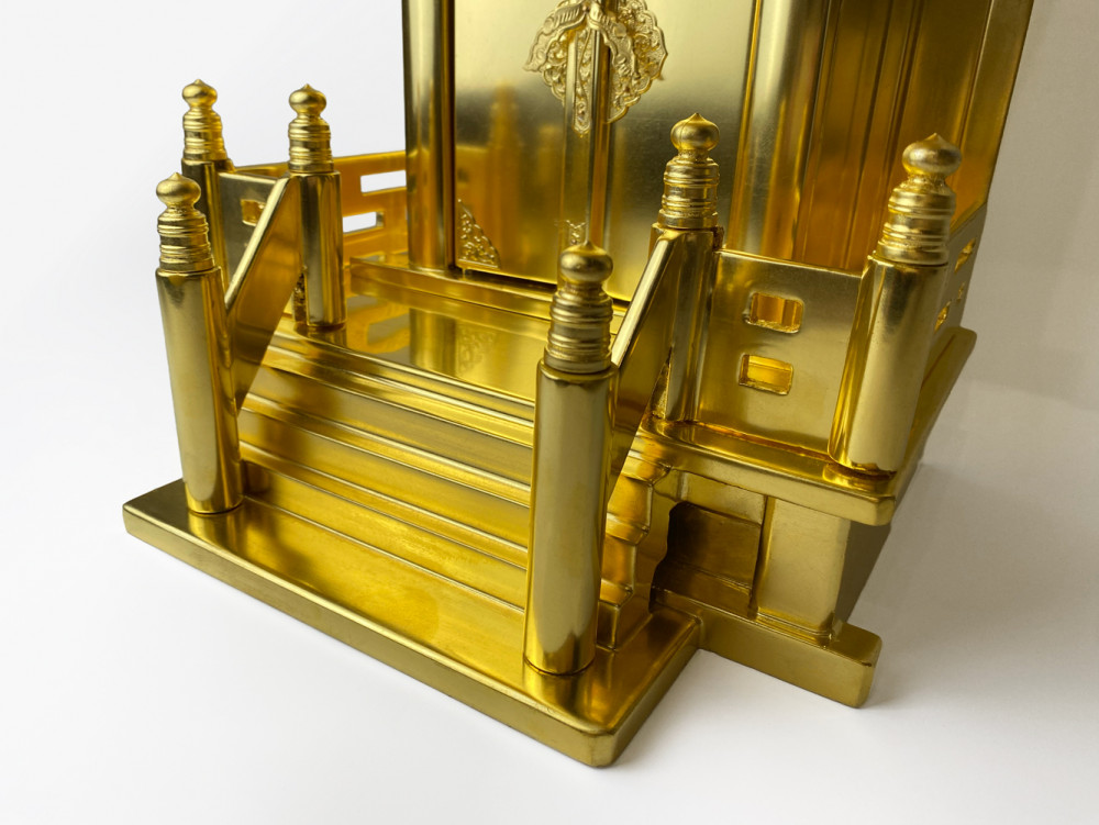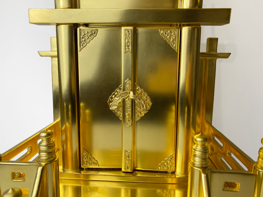 派手なメッキとは異なる、純金ならではの神秘的な輝きには、いつの時代も人々の心を惹きつける力があります。繊細な金箔を職人が一枚ずつ丁寧に貼り重ねた、神聖な逸品。