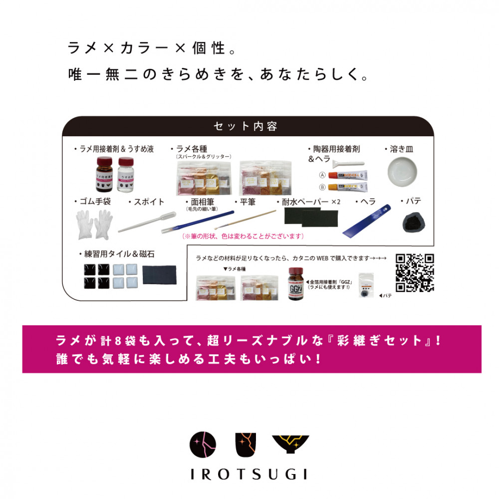 ●ここにしかない!「ラメ」をつかう彩継ぎセット。唯一無二のきらめきを、あなたらしく。リーズナブル且つクリエイティブで楽しい彩継ぎセットはカタニのオリジナル商品。オススメ!『通販限定商品』です。練習用部材付き!