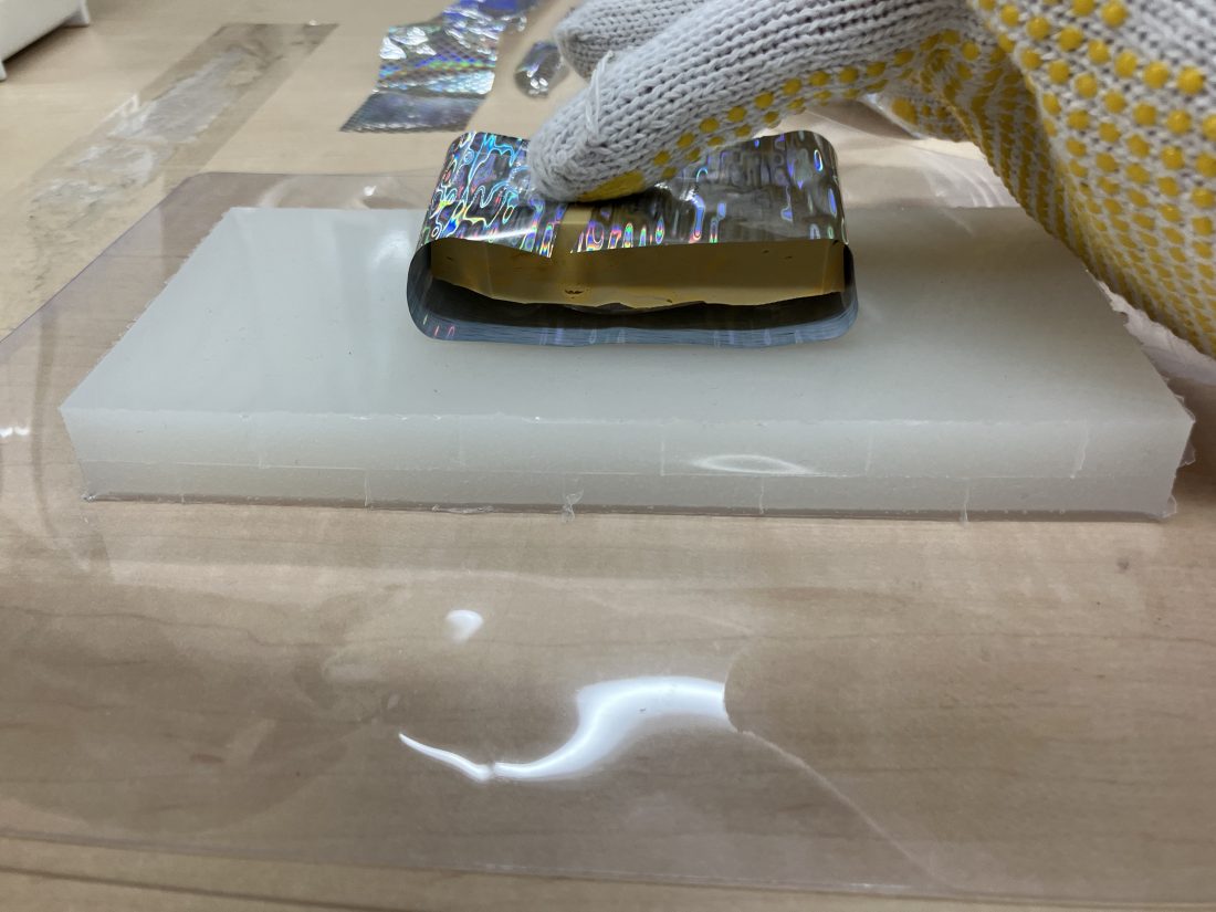 耐熱シリコン板を自作、アイロンでシリコンを温めて箔を熱転写します。