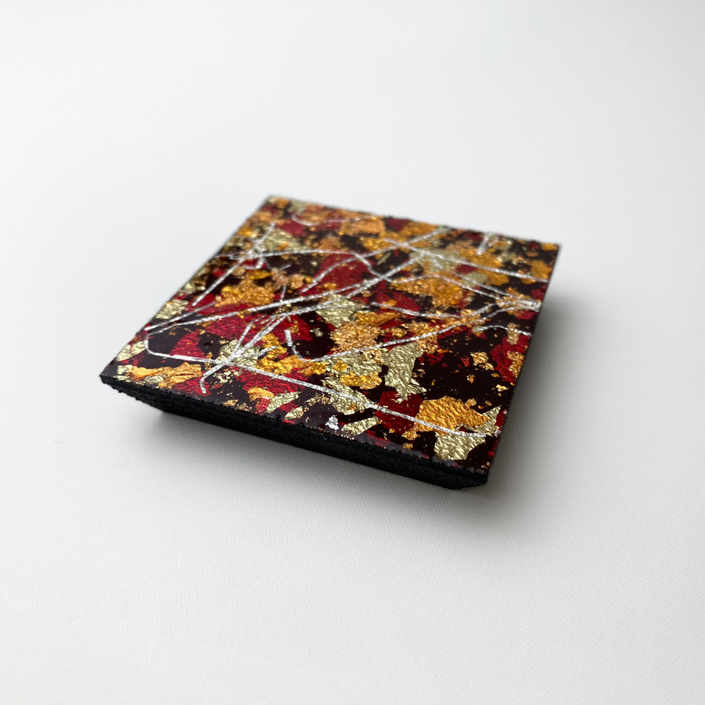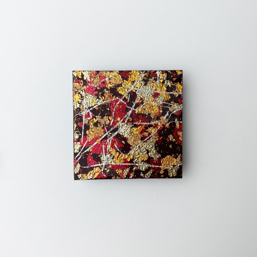 金箔、銀箔、着色箔などを複雑に重ね合わせることにより生まれる、光の複雑な表情を楽しむことができます。